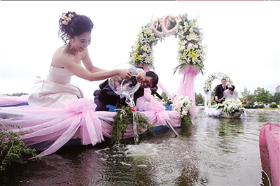 昨天,新人們攜手將象征和平、幸福、美好、富有的金魚倒入池中。當(dāng)天早上7點(diǎn)多鐘,北京太陽宮公園內(nèi)的水上游園里多了3艘被各式鮮花裝扮得十分漂亮的花船,有三對新人將在這里舉辦京城首場浪漫的“水上集體婚禮”。上午8時,集體婚禮準(zhǔn)時開始,在婚禮進(jìn)行曲及主持人的祝福聲中,新人們踏上“花船”,新娘坐船頭,新郎搖槳,水中“漫游”,新人們船中相互許愿,并攜手將象征和平、幸福、美好、富有的金魚倒入池中……