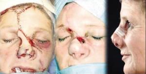 去年8月的一個(gè)深夜,她被一陣劇烈的咆哮聲吵醒,只見“奧利”正從床上跳下地面。普林塞斯回憶道:“我感覺一滴鮮血正從臉上滴下。由于疼痛難忍,我急忙下床沖進(jìn)衛(wèi)生間照鏡子。我打開燈,簡(jiǎn)直不敢辨認(rèn)鏡中的那個(gè)人—— 一切就像恐怖片中的鏡頭!”原來,在普林塞斯的面部中央,鼻子不翼而飛,只留下兩個(gè)如同金魚眼睛般大小的洞穴。出奇冷靜的她一邊高聲喊醒大兒子卡奇呼叫救護(hù)車,一邊用一條沾了水的毛巾將面部緊緊裹住。