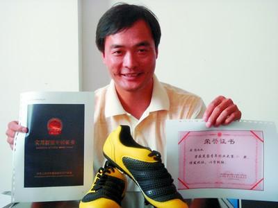 家住芙蓉區(qū)的周凱說,這雙球鞋的設(shè)計得追溯到幾年前!澳翘欤覐碾娨曓D(zhuǎn)播上看到貝克漢姆射出一個漂亮的弧線球,當(dāng)時就被震驚了。從那以后,我就時常想,是不是我也能踢出一個這樣的弧線球。”經(jīng)過20幾次修改圖紙,2005年,周凱向國家知識產(chǎn)權(quán)局提交了申請報告;2006年5月,產(chǎn)品獲得“實用新型專利證書”,產(chǎn)品名稱就叫:可加快足球旋轉(zhuǎn)的足球鞋。今年5月,周凱又憑此鞋獲得了“芙蓉青年創(chuàng)業(yè)大賽銀獎”。