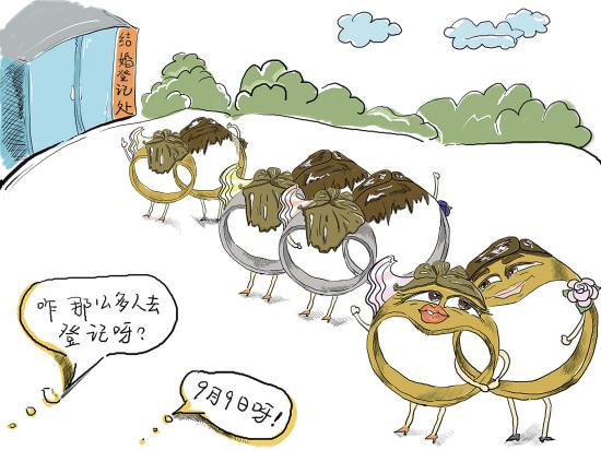今天是2009年9月9日,成為眾多年輕人喜定終身大事的好日子。不少年輕男女選在今天去登記結(jié)婚,有的選在今天大擺喜宴……他們看中的是這個(gè)日子里蘊(yùn)含的百年一遇的“久久久”好彩頭。民俗專家解釋說(shuō),2009年9月9日,因諧音讀起來(lái)像“愛(ài)你久久久”,吸引了許多年輕人選擇在今天喜結(jié)良緣,祈求婚姻長(zhǎng)久。這一現(xiàn)象源于古人對(duì)數(shù)字的崇拜,現(xiàn)在人們利用漢字之間的諧音,以祈福表達(dá)良好祝福。