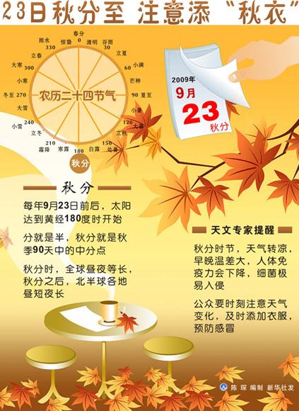 23日將迎來農(nóng)歷二十四節(jié)氣的“秋分”。天文專家提醒,隨著秋分節(jié)氣的到來,氣溫降低的速度將明顯加快,公眾要準(zhǔn)備好換季的秋裝。
