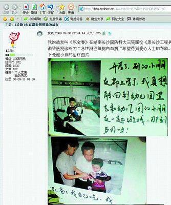 “我的戰(zhàn)友叫陳金春……三級士官轉(zhuǎn)業(yè),現(xiàn)在他的小孩被……診斷為‘急性淋巴細胞白血病’希望得到愛心人士的幫助。”今年9月6日,戰(zhàn)友在某網(wǎng)站論壇上為陳金春女兒發(fā)出求助帖。不少網(wǎng)友打電話咨詢情況,并郵寄財物幫助小飛月。