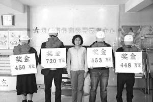 在網(wǎng)民貼出的領(lǐng)獎(jiǎng)?wù)哒掌,偶爾的?chuàng)新就被網(wǎng)民頒了“最有創(chuàng)意服裝獎(jiǎng)”,獲這一榮譽(yù)的是2008年貴州體彩大樂(lè)透500萬(wàn)得主,他一身蜘蛛俠的打扮,似乎得到這個(gè)稱號(hào)也是應(yīng)該的。而“最沮喪領(lǐng)獎(jiǎng)服獎(jiǎng)”就頒給了另外一組得獎(jiǎng)?wù),領(lǐng)獎(jiǎng)人頭戴棒球帽,胸前戴朵大紅花,為了不被拍到正面,全都低下了腦袋。