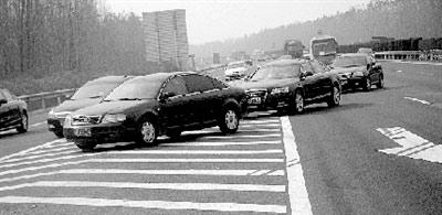10時30分許,在京港澳高速公路695公里東半幅,18輛清一色的奧迪轎車一字排開向北行進。突然,領(lǐng)頭轎車踩起剎車,從行車道兜到超車道上,隨即向右猛拐。它身后一長串轎車也接連紛紛拐彎,形成約30米長的半圓形,東半幅公路立即被堵死。此時,車隊身后300米范圍內(nèi)至少有4輛大卡車和轎車,剎車聲立即響成一片。