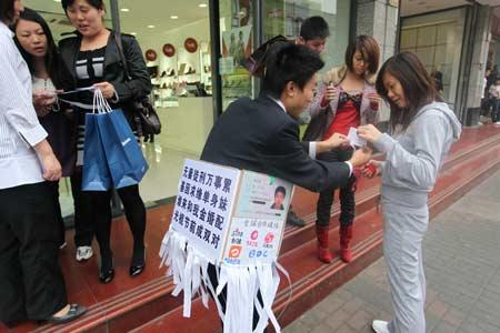 昨天上午8點(diǎn)半,天涯論壇上海版上一片“雷人”的呼聲,原來(lái)一個(gè)圖片帖“光棍兇猛,圍觀上海南京路求愛(ài)牛人!”引來(lái)了網(wǎng)友們熱議。記者在帖子里看到,一個(gè)高高瘦瘦的西裝男,套著個(gè)面上寫(xiě)有“無(wú)妻徒刑萬(wàn)事累,基因求緣單身妹,誰(shuí)來(lái)和我金婚配,光棍節(jié)前成雙對(duì)”,底下黏有無(wú)數(shù)寫(xiě)滿(mǎn)聯(lián)系方式紙條的硬紙箱“草裙”,在人民廣場(chǎng)地鐵出口處到處找姑娘派發(fā)小紙條,路人紛紛駐足觀看,有女孩還