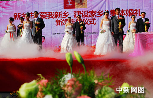中新網(wǎng)新鄉(xiāng)11月22日 (記者 史寶銀 向明超)11月22日上午,由新鄉(xiāng)市文明辦、共青團新鄉(xiāng)市委、新鄉(xiāng)市婦女聯(lián)合共同主辦的“愛我新鄉(xiāng)、建設家鄉(xiāng)”集體婚禮在新鄉(xiāng)市人民公園東門廣場隆重舉行。慶典儀式上,新郎新娘紛紛捐出了自己的禮金,購買了5000枚石榴花圖案的新鄉(xiāng)市徽向市民免費發(fā)放,同時倡議市民熱愛家鄉(xiāng),建設家鄉(xiāng)。