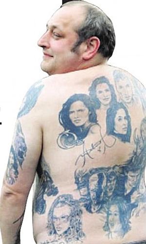 據(jù)英國媒體9日報道,英國41歲男子斯蒂夫·波特(右圖)堪稱是一名“超級追星族”,在過去10來年中,他將自己最喜愛的24名歐美影星和搖滾歌星的頭像都文在了自己的前胸、后背、臂膀以及大腿上。其中的12個明星還在波特的身體皮膚上留下了各自的親筆簽名。每當一個明星用筆在波特的皮膚上簽名后,波特就會立即趕往一個文身藝術家的工作室中,請文身藝術家將他最新得到的名人簽名也永久性地文在他的皮膚上。據(jù)悉,波特目前計劃申請吉尼斯世界紀錄。