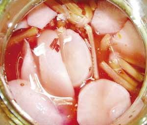 3.將腌好的白蘿卜洗去鹽分后瀝干,并加入做法2的材料一起攪拌均勻,放在干凈無水的容器中,再把調(diào)味料倒入即可;