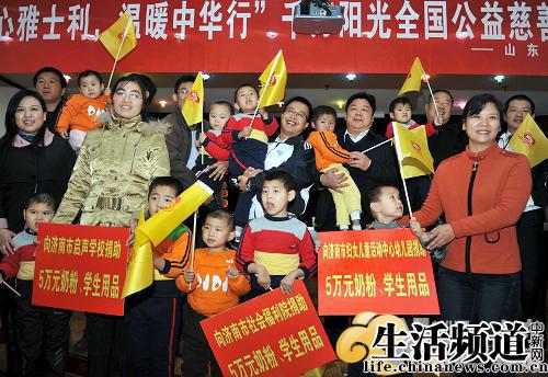 雅士利集團(tuán)山東營(yíng)業(yè)部經(jīng)理馬紅兵表示:雅士利一直以來(lái),將公益活動(dòng)當(dāng)作自己的使命,當(dāng)作一項(xiàng)偉大的事業(yè),盡心盡力地做好它。希冀以此來(lái)回報(bào)社會(huì)多年來(lái)對(duì)雅士利品牌的信任和厚愛!雅士利人從扶貧救災(zāi),到修橋造路;從文化體育,到醫(yī)療衛(wèi)生的公益道路上永不停步,多形式向社會(huì)捐款捐資超4000萬(wàn)元。雅士利將通過(guò)這項(xiàng)千萬(wàn)陽(yáng)光工程,并和山東省慈善總會(huì)合作,捐贈(zèng)價(jià)值50萬(wàn)元的奶粉一批,對(duì)邊遠(yuǎn)地區(qū)弱勢(shì)群體,對(duì)兒童的健康和教育給予特別關(guān)愛,希望繼續(xù)將“愛心”與“溫暖”灑向齊魯大地。
