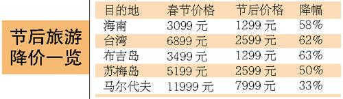 一路飆漲的旅游價格終于從今天開始大幅跳水。來自各大旅行社的報價顯示,與春節(jié)黃金周相比,即日起節(jié)后整體旅游價格下降三至四成,最高降幅超過六成。其中降幅最大的是春節(jié)期間漲至萬余元的三亞酒店房價,節(jié)后跳水將近八成。