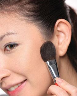 腮紅方面選用橘色腮紅,少量使用,制造出健康感的肌膚狀態(tài)。制造小臉效果在裸妝里同樣不能省略,只是在顏色選擇上,盡可能選擇自然的色調(diào),千萬(wàn)不要因?yàn)樨潏D更大的縮臉效果,就選擇深色的修容粉。將修容粉沿著發(fā)際到下頜的位置輕輕掃上去,是由外向內(nèi),靠近耳根的顏色最深。注意腮紅和陰影的銜接要自然過(guò)渡。