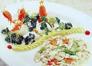 第二道墨魚籽花蝦則是以南瓜茸、蝦球、墨魚籽、麻油散子為原料制作而成,據(jù)了解,麻油散子是上海的傳統(tǒng)小吃,此菜在民間小吃的基礎(chǔ)上,增加墨魚籽、龍蝦肉等提鮮食材,經(jīng)烹調(diào)融合為一體,彰顯清淡、環(huán)保、綠色。
