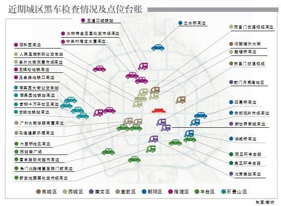 分布在“黑車(chē)地圖”上的128個(gè)重點(diǎn)地區(qū)中,東城6處、西城10處、崇文8處、宣武15處、朝陽(yáng)28處、海淀19處、豐臺(tái)33處、石景山9處。其中,豐臺(tái)、海淀和朝陽(yáng)三區(qū)的黑車(chē)分布點(diǎn)以絕對(duì)優(yōu)勢(shì)占據(jù)前三甲,總量占到近7成。
