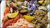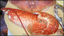 我們接受了店長(zhǎng)的建議,從鎮(zhèn)上的小店買來面包和飲料回來,待我們歸來,位子也正好等到了,拼桌!看著菜單上豐富誘人的海鮮,我早已等不及了, 點(diǎn)了這里的招牌菜:兩人份海鮮拼盤(9.5磅每人),其中包括, 美味大蟹,深黃粉紅對(duì)蝦, 多汁鳥蛤(海扇),腌熏三文魚,對(duì)蝦,鯡魚,煙熏馬加魚,蚌和綠蚌貝,另外我們還點(diǎn)了大龍蝦,奶油蒸歐洲蠔(只有9月和4月之間可以吃到)和蔬菜沙拉。品嘗海鮮最好配以檸檬,芥末,醋,壽司醬油,和辣椒醬。 店內(nèi)提供檸檬,塔巴斯哥辣醬油和醋,如果你還想要什么配料,可以在小鎮(zhèn)的店上找到。