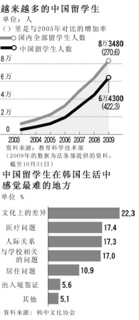 去海外留學的韓國留學生在2005年到2009年之間增加了26.5%的情況相反,相同時期內國內的外國留學生增加了約270%。這一期間內中國留學生人數(shù)激增了422%。