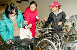 在服務(wù)項目的啟動儀式上,14名分別來自中國、越南和印度尼西亞的留學(xué)生來到活動現(xiàn)場。平和文化中心的工作人員們在啟動儀式上搞了個別出心裁的游戲,特意請這些留學(xué)生們從事先準(zhǔn)備好的30輛自行車中,分別按照型號和顏色各選出一輛最受歡迎的車。