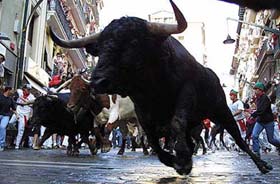 自從海明威的小說《太陽照常升起》問世,特別是他獲得諾貝爾文學(xué)獎(jiǎng)以后,世界上越來越多的人就知道了西班牙的奔牛節(jié),知道了在那個(gè)最浪漫的國度有一種最浪漫的節(jié)慶,其宣泄程度遠(yuǎn)非任何一種狂歡節(jié)可比。想一想斗牛場上那滿身是血、橫沖直撞、兇悍無比的大公牛,如果與它們一起狂奔共舞,而且是成千上萬的年輕人與它們一起瘋狂奔跑在一條狹窄的街道上,那該是何等的刺激!于是,在無數(shù)人的想像中,西班牙奔牛節(jié)就意味著勇敢、浪漫、刺激和瘋狂的宣泄,同時(shí)也必定險(xiǎn)象環(huán)生。