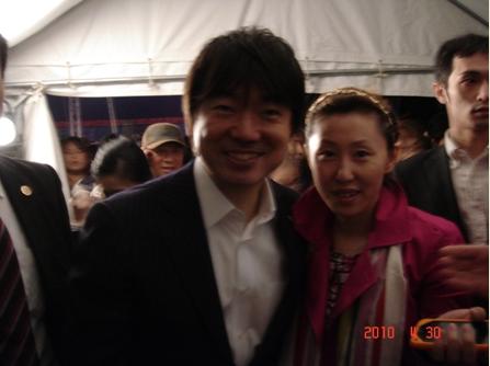 在大阪日本橋開辦四川料理店鳳家的中國女留學(xué)生汪哲有幸接到了邀請函,不但進(jìn)入了會場,還坐在橋下知事很近的座位上,演出結(jié)束后,汪哲突然產(chǎn)生了一股勇氣,來到了橋下知事的身邊,她大膽地拉住了橋下知事的手,向橋下知事介紹了自己在大阪宣傳上海世博會的努力,橋下知事也被上海世博會的慶祝氣氛深深地感染了,顯得很有興趣地聽完了汪哲的自我介紹;接著汪哲乘勝追擊邀請橋下知事與她合影留念,并留下了珍貴的紀(jì)念照片。