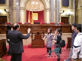 進(jìn)入議會大廳以后,一名議會工作人員負(fù)責(zé)接待留學(xué)生,他詳細(xì)地向留學(xué)生們介紹了議會的歷史以及現(xiàn)況:加泰羅尼亞議會大樓原來是專門建立給西班牙國王和王后在巴塞羅那的寢宮,但建成以后王后沒有接受這個宮殿作為她的寢宮,所以該大樓也一直沒有作為宮殿用過。之后就作為存放武器和軍人的居住點,在弗拉明戈時期都是作為武力和壓迫的象征。該大樓從1932到1936年首次作為加泰羅尼亞議會,現(xiàn)在民主時代也就是從1980年再次作為議會使用。加泰羅尼亞各黨派議會議員現(xiàn)在都在此上班,加泰羅尼亞議會是審批加區(qū)各大小法律法規(guī)的地方,密切關(guān)系加區(qū)民眾民生。之后解說員帶領(lǐng)留學(xué)生們參觀了加議會各個大廳及各個會議室,向留學(xué)生們介紹了每個廳在議會的作用,正如我們經(jīng)常在電視上看到的,比如召開記者發(fā)布會的記者大廳,議會議員表決大廳等等。議會的建筑設(shè)計風(fēng)格即富麗堂皇又富有當(dāng)?shù)亟ㄖL(fēng)格氣息。