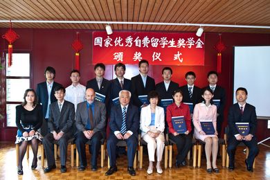董大使首先向獲獎(jiǎng)?wù)吆退麄兊膶?dǎo)師及親人表示熱烈的祝賀,向留瑞學(xué)人表示親切的問候。他指出,設(shè)立“國家優(yōu)秀自費(fèi)留學(xué)生獎(jiǎng)學(xué)金”是新時(shí)期貫徹國家“支持留學(xué),鼓勵(lì)回國,來去自由”留學(xué)工作方針的重要舉措,自2003年設(shè)立以來累計(jì)獲獎(jiǎng)人數(shù)已達(dá)1900余人。2009年度共497人獲獎(jiǎng),其中瑞士有15位在校博士生獲得這一殊榮。這是歷年來獲獎(jiǎng)人數(shù)最多的一次,顯示了在瑞士中國留學(xué)人員的實(shí)力和水平。
