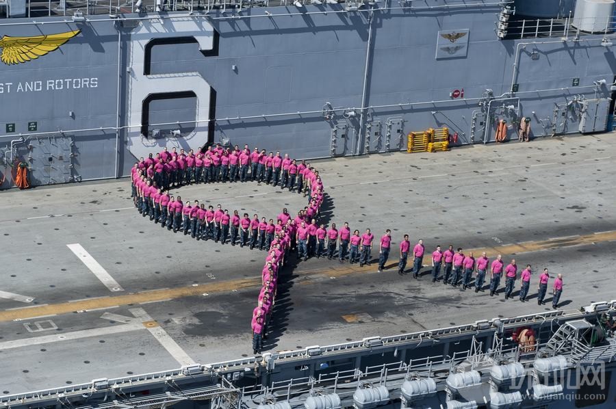 艦員們身著粉紅色衣服在甲板上站成一條絲帶的形狀,一次表示他們對乳腺癌宣傳周的支持。