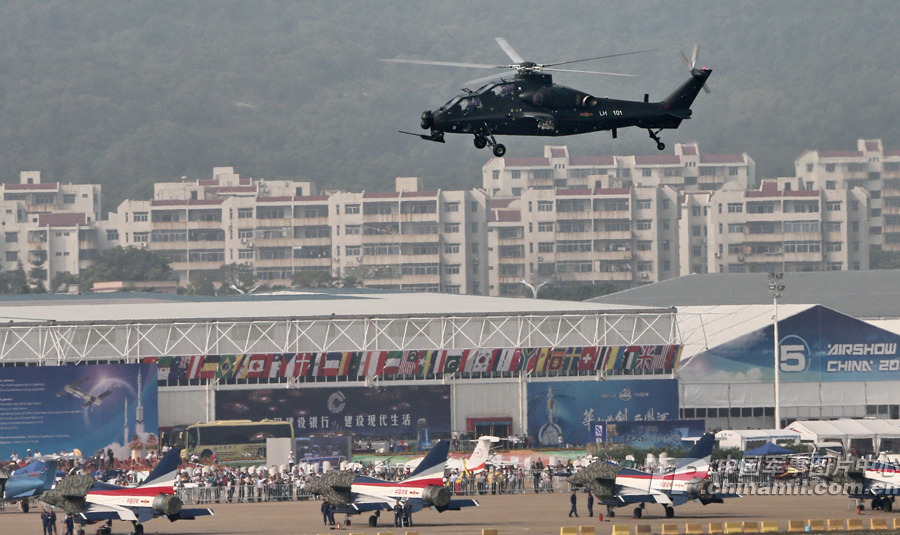 11月13日,我國自主研制生產的武直-10武裝直升機亮相在珠海舉行的第九屆中國國際航空航天博覽會,在飛行表演中展示了這款直升機的優(yōu)良性能。記者喬天富攝