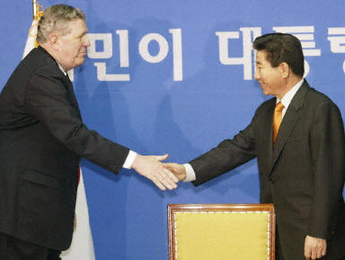 韓國當(dāng)選總統(tǒng)盧武鉉13日在漢城接見了美國總統(tǒng)布什的特使、助理國務(wù)卿凱利,雙方就朝鮮核問題交換了意見。盧武鉉在會談中強調(diào),韓美兩國應(yīng)通過對話而不是武力來解決朝鮮核問題。凱利在結(jié)束對韓國的訪問后,還將前往中國、新加坡、印度尼西亞和日本訪問。