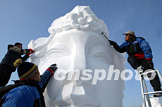 參加哈爾濱第十五屆冰雪博覽會雪雕比賽的中國選手正在精心雕琢作品“鹿神”,希望在最終評比中勝出。作者:毛建軍