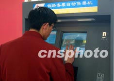十七日,上海正式打響為期四十天的“春運(yùn)保衛(wèi)戰(zhàn)”。為緩解春運(yùn)期間旅客售票難的問題,上海推出“鐵路客票自動售票機(jī)”,一位旅客應(yīng)用電腦觸摸信息購票。作者:湯彥俊