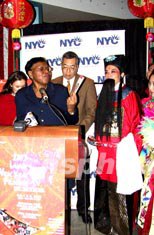 美國亞美商業(yè)發(fā)展中心邀請紐約市旅游局共同舉辦中國農(nóng)歷羊年新春慶祝活動。一月十六日,主辦者在曼哈頓中城舉行記者會,亞美商業(yè)發(fā)展中心總裁王章華(中)介紹帝國大廈亮燈慶祝以及紐約華埠即將舉行的多項活動。曼哈頓區(qū)區(qū)長費絲(左)特意前來祝賀,她拿著剛剛出版的《華埠旅游指南》愛不釋手,希望慶;顒幽芡苿尤A埠和曼哈頓的經(jīng)濟復蘇。作者:趙海燕