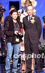 香港青年時裝設計家創(chuàng)作表演賽2003,1月17日在香港時裝節(jié)上舉行,自由設計師馬詩淇〔左〕作品榮獲全場總冠軍。洪少葵 攝