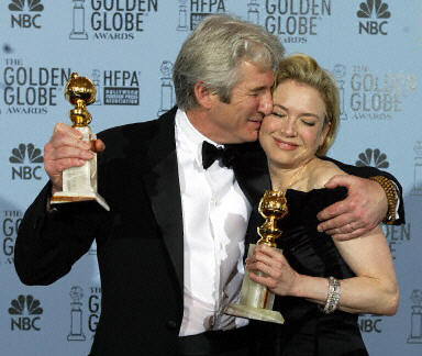 圖為李察·吉爾(左)和芮妮·齊維格(右)分別獲得音樂喜劇類電影最佳男、女主角獎。