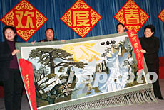 國務院僑辦主任陳玉杰(右一)與副主任李海峰(左一),二十七日在僑辦新春聯歡會上,代表國務院僑辦機關接受機關定點扶貧地區(qū)甘肅積石山縣代表贈送的新年壁毯禮品。作者:鄒憲