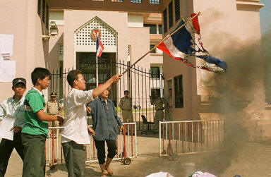 他信在聲明中說,29日傍晚,上千名柬埔寨暴徒借口泰國某位女影星發(fā)表了對柬埔寨不友好的言論,圍攻泰國駐柬大使館,縱火焚燒泰國國旗和使館館舍。同時,部分泰國人在金邊開設的賓館、商店也遭暴徒搶劫或縱火。