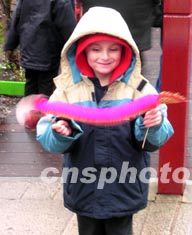 農(nóng)歷新年,英國(guó)曼徹斯特唐人街舉行盛大賀歲活動(dòng),圖為英國(guó)小童饒有興趣地玩“中國(guó)龍”。 盧峰 攝
