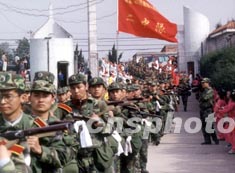 解放軍軍事經(jīng)濟(jì)學(xué)院的學(xué)員隊(duì)伍新春展開(kāi)行軍演練,途中在湖北省谷城縣受到百姓官員夾道歡迎。作者:王偉兵