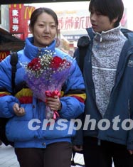 北京姑娘在“情人節(jié)”當(dāng)天得到男友一束鮮花。這一天,在西單商業(yè)街,這種場面比比皆是。作者:鄒憲