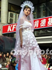 二月十六日,北京西單一家婚紗影樓借情人節(jié)刮起的浪漫旋風(fēng),不失時機地舉辦了一場婚紗秀,吸引了不少觀眾。作者:杜洋