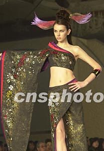 日本著名時(shí)裝設(shè)計(jì)師桂由美(Yumi Katsura)大膽采用和紙、竹工等日本傳統(tǒng)工藝,作出新穎的時(shí)裝,十八日在東京展示的和服借用了和紙剪繪的工藝技術(shù)。作者:陶光雄