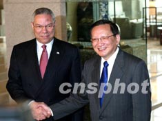 中國外交部長唐家璇二十四日上午在北京與美國國務(wù)卿鮑威爾舉行會談,參加會談的美方人員有美國駐華大使雷德等,雙方就中美關(guān)系及共同關(guān)心的國際和地區(qū)問題廣泛深入交換了意見。作者:鄭萍萍
