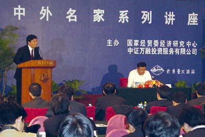據(jù)了解,“中外名家系列講座”是由國家經(jīng)貿(mào)委經(jīng)濟(jì)研究中心和中證萬融投資服務(wù)有限公司聯(lián)合主辦。自2001年9月起已舉辦了37期(每月2期),受到社會各界特別是企業(yè)界的廣泛好評。參加此期講座的嘉賓中,有來自企業(yè)界的知名人士及各大媒體領(lǐng)導(dǎo)。此期講座由專項(xiàng)部主任支東升主持。
