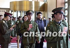 全國政協(xié)委員二十七日陸續(xù)抵京,北京人民大會(huì)堂安檢測(cè)試工作進(jìn)入最后階段。圖為解放軍工作人員手持兩會(huì)有效證件在大會(huì)堂內(nèi)進(jìn)行安檢測(cè)試。作者:廖文靜