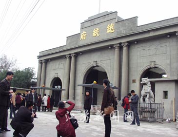 在門樓前,一九五八年被大煉鋼鐵融化的鐵門,現(xiàn)按照一九二九年“總統(tǒng)府”的照片,經(jīng)電子技術(shù)復(fù)原,四十五年后又重新恢復(fù)了原樣。東西兩座邊門共四扇,每扇鐵門的重量都超過一點五噸,而中間的大門每扇就近三噸。門樓上方的"總統(tǒng)府"三個閃著金光的大字,也是事隔五十八年后,去年十一月二十日才重新放上去的。