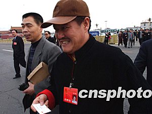 影視明星趙本山三月四日參加全國人大十屆一次會議的預(yù)備會途中,忙于接受代表和新聞界遞來的名片。作者:賈國榮