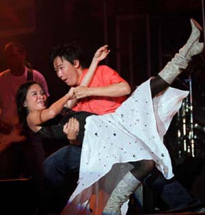 李心潔當(dāng)晚和好友阿牛的“親密”演出掀起全場(chǎng)高潮,為了阿牛,李心潔又是伴舞又是陪唱,更破例在臺(tái)上演唱廣東歌《失戀好煩》,雖然只是和音,但她和阿牛的“阿哥哥”舞就叫大家忍不住HIGH起來(lái),最后心潔更把右腳踩在阿牛的左大腿上,讓阿牛驚呼∶“李心潔,終于踩對(duì)地方了!大家知不知道她彩排時(shí)常踩錯(cuò)地方!”臺(tái)下一陣爆笑!