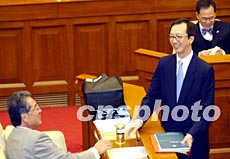 香港特區(qū)政府3月5日公布備受關(guān)注的香港2003至2004年度財(cái)政預(yù)算案,圖為財(cái)政司司長(zhǎng)梁錦松抵達(dá)立法會(huì)提交財(cái)政預(yù)算案時(shí)與議員交談甚歡。  洪少葵 攝