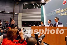 香港財(cái)政司司長梁錦松與財(cái)經(jīng)事務(wù)及庫務(wù)局局長馬時亨等官員,3月5日在政府總部舉行記者會,就剛發(fā)表的2003至2004年度財(cái)政預(yù)算案,回答記者問題。洪少葵 攝