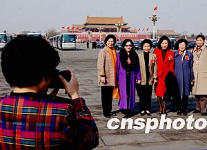 三月八日國際婦女節(jié)之日在北京出席全國政協(xié)十屆一次會議的政協(xié)女委員們,相互在北京天安門廣場合影。作者:賈國榮
