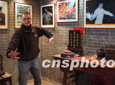 加拿大楓葉尋根之旅的華裔青年十日來(lái)到廣東順德杏壇右灘村尋根,營(yíng)員鄭國(guó)棟在李小龍祖居擺姿勢(shì)留影。作者:羅仰明