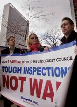 這份包括60萬(wàn)美國(guó)人的簽名請(qǐng)?jiān)笗?shū)呼吁聯(lián)合國(guó)安理會(huì)繼續(xù)對(duì)伊拉克進(jìn)行武器核查以避免戰(zhàn)爭(zhēng)。名叫“蠃得勝利,不用戰(zhàn)爭(zhēng)”的聯(lián)合會(huì)表示,他們希望通過(guò)這些安理會(huì)常任理事國(guó)代表向各自國(guó)家政府傳遞這樣一個(gè)信息:薩達(dá)姆·侯賽因可以在避免戰(zhàn)爭(zhēng)的情況下被監(jiān)督。他們這么做,旨在為聯(lián)合國(guó)核查人員爭(zhēng)取必要的時(shí)間以完成自己的職責(zé),而并不是請(qǐng)求什么不可實(shí)現(xiàn)的東西。